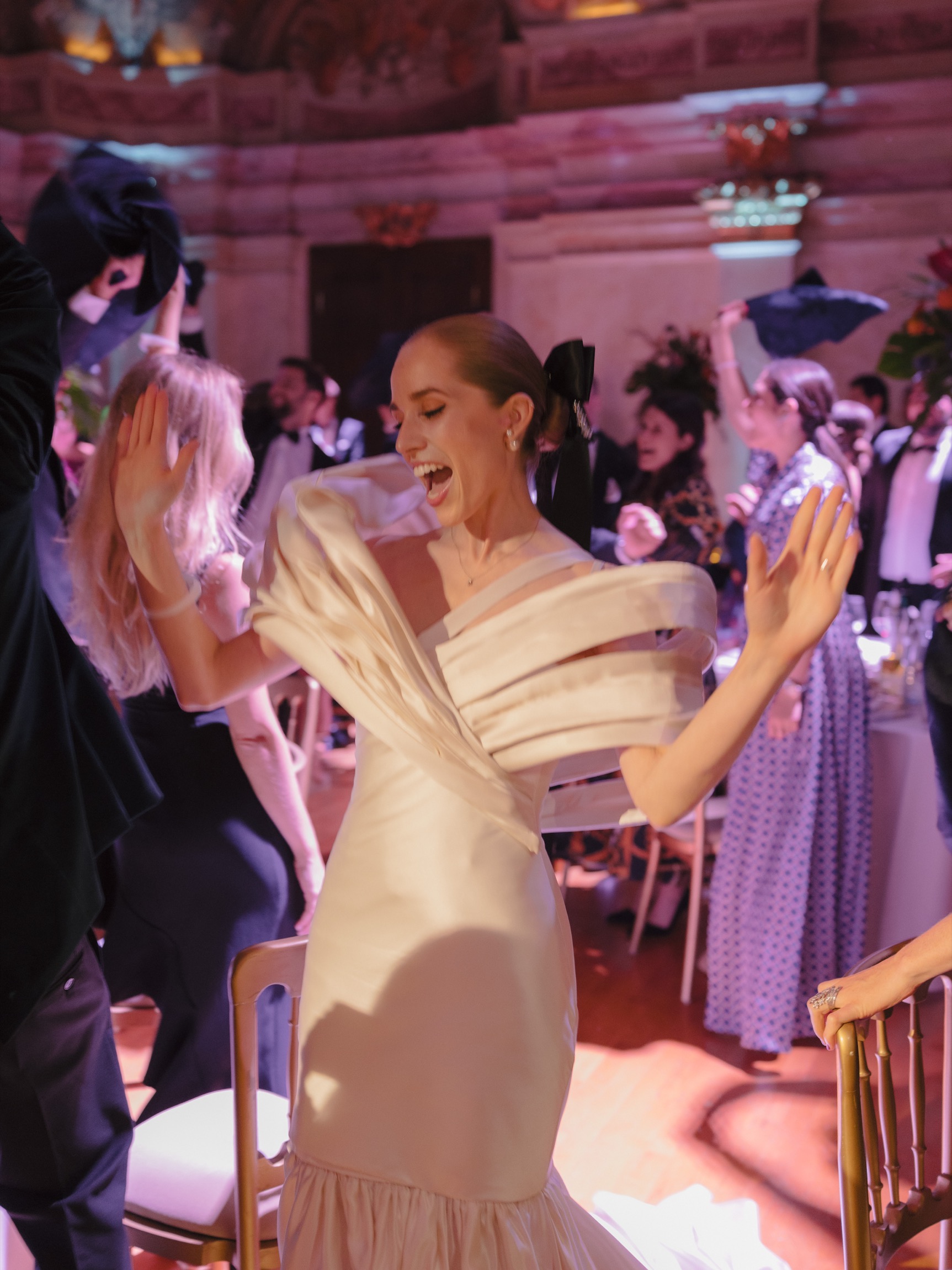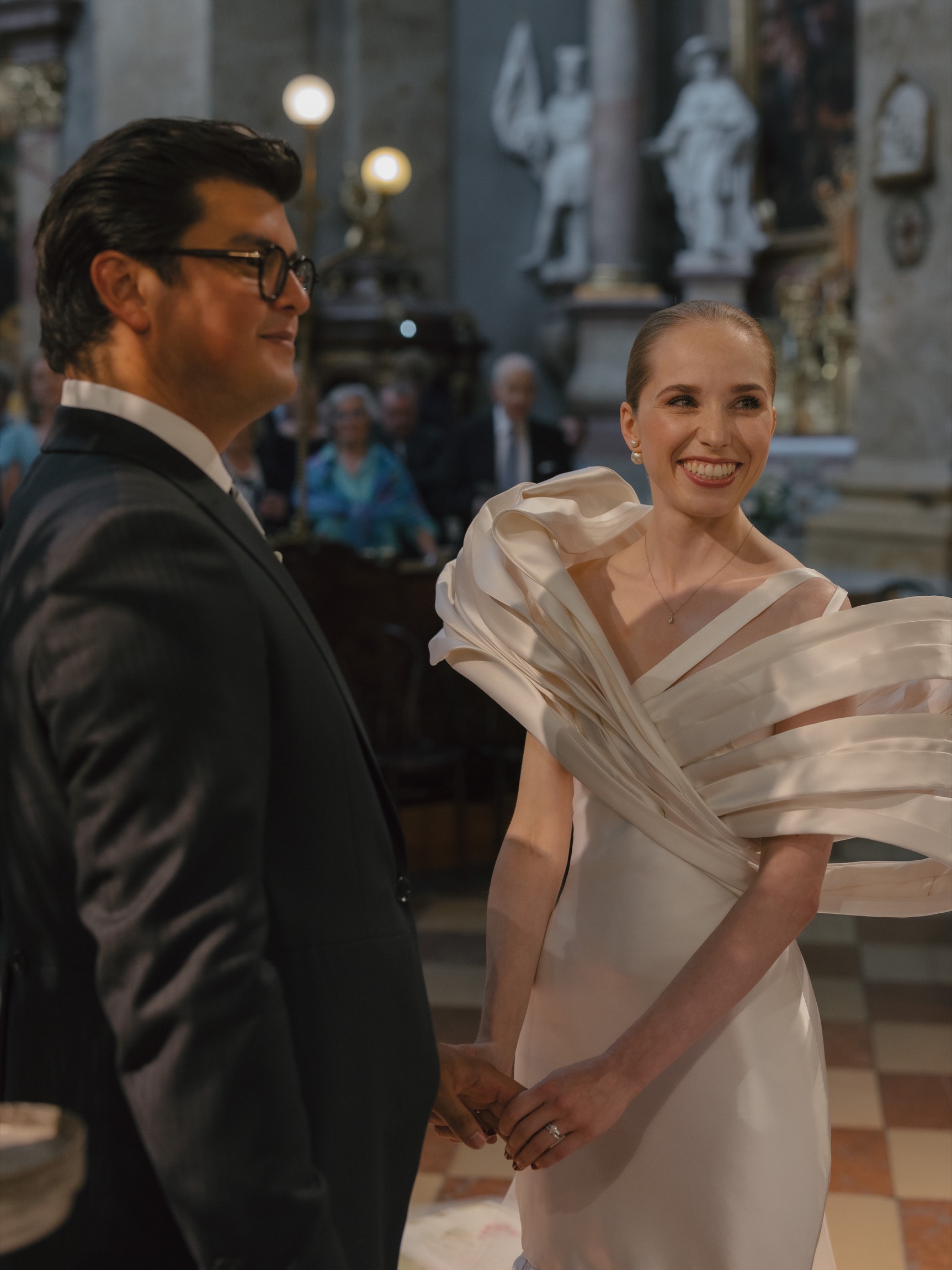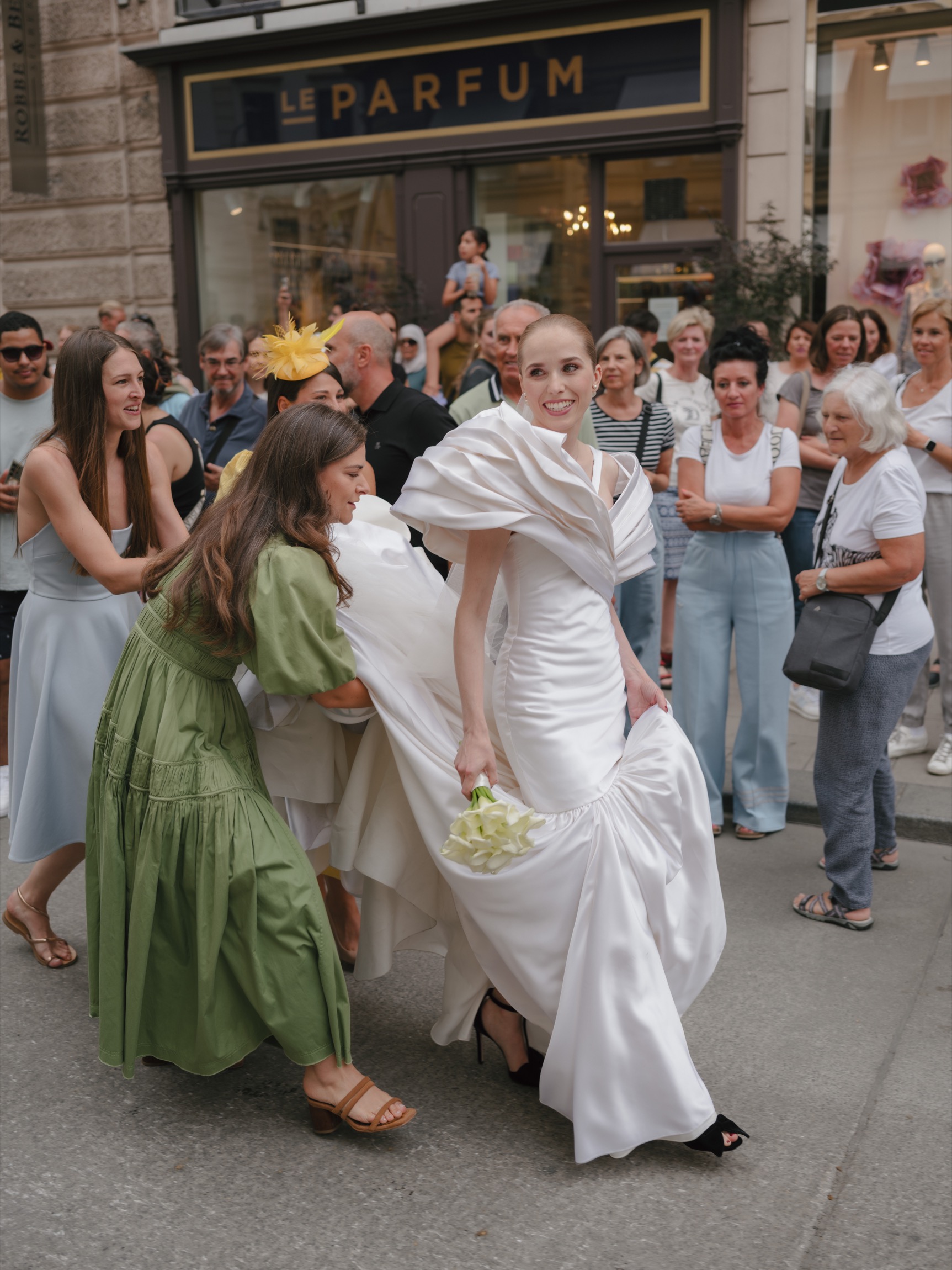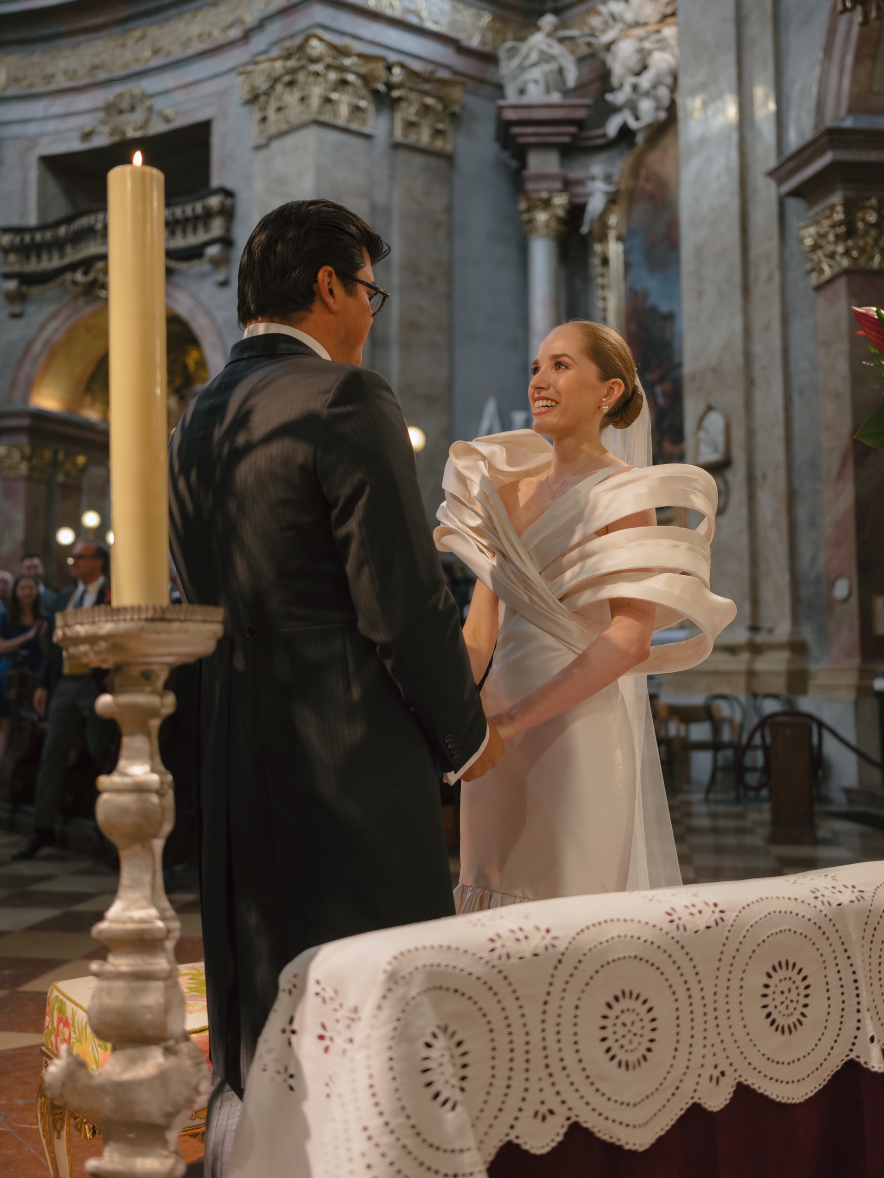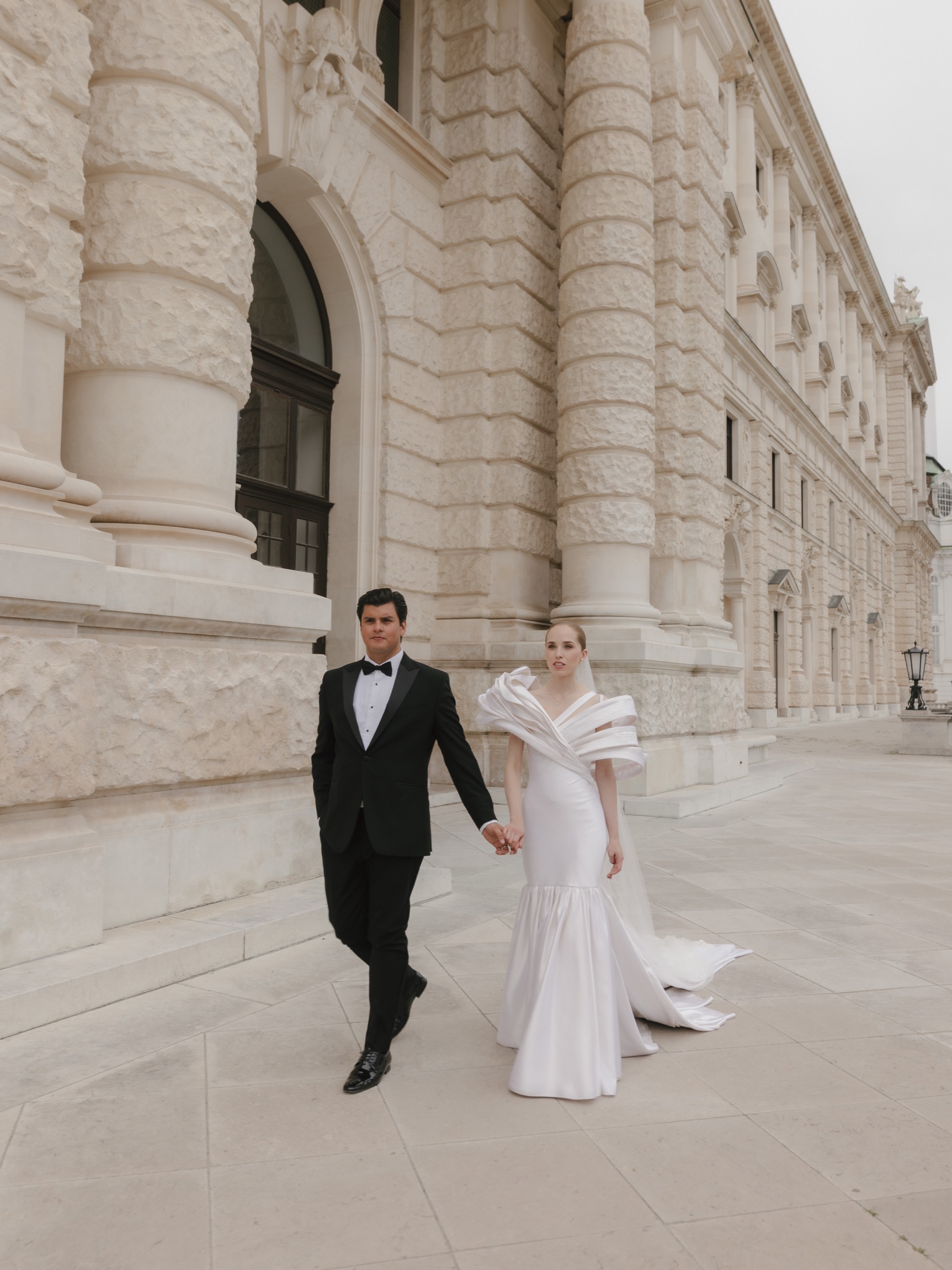 The day began in Vienna’s iconic first district with a beautiful ceremony. As Anna appeared in her bespoke wedding gown by designer Katharina Reuschel, she literally stopped the city in its tracks. The gown, a work of art requiring two people to manage throughout the day, left the onlookers outside the venue in awe. After the ceremony, the couple and their guests made their way to a nearby Italian restaurant for a relaxed reception drink and delicious pizza bites. Walking through the bustling streets of Vienna with Anna’s breathtaking gown and a lively wedding party was a spectacle worthy of a red carpet.