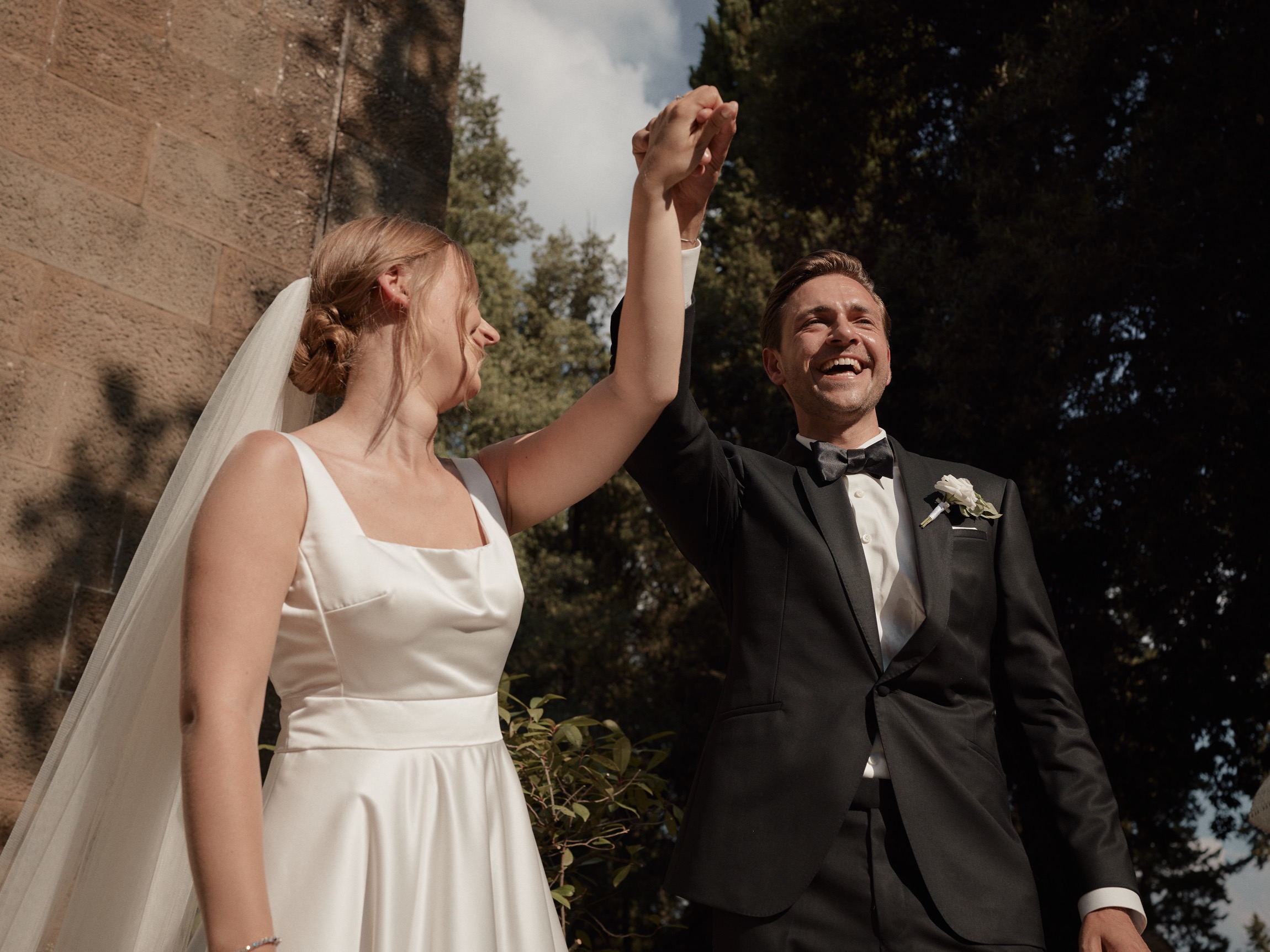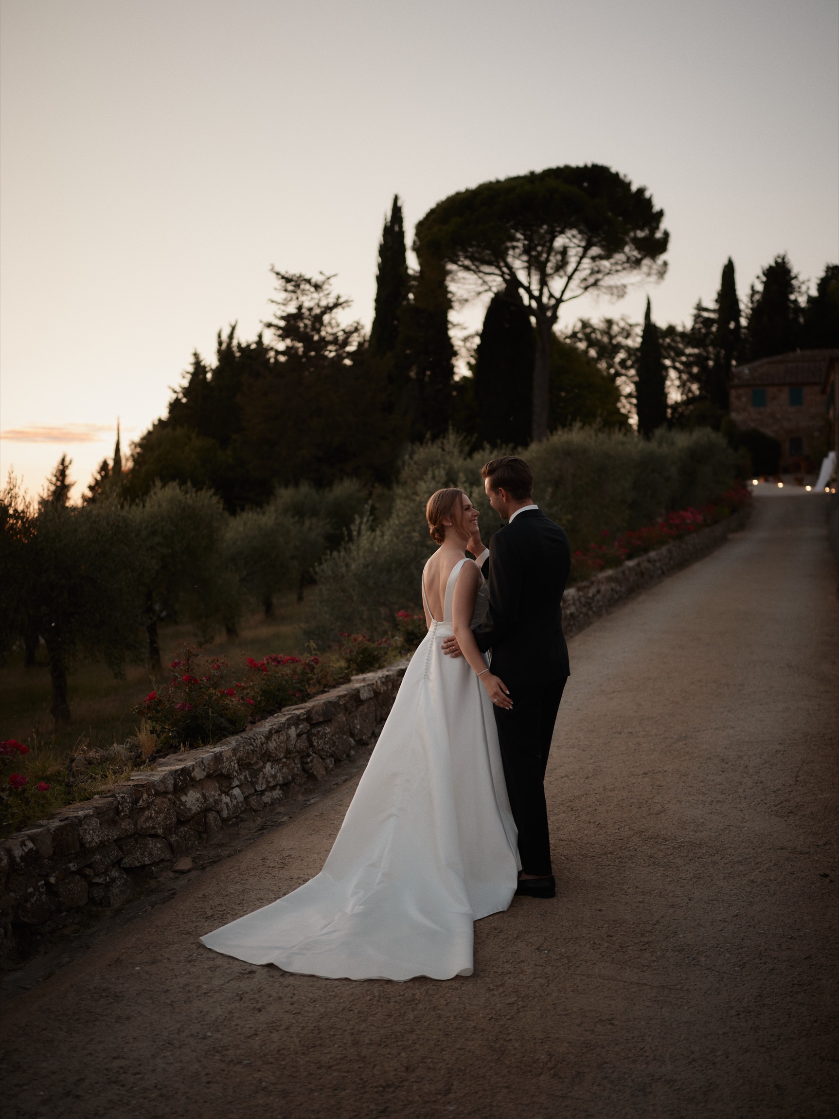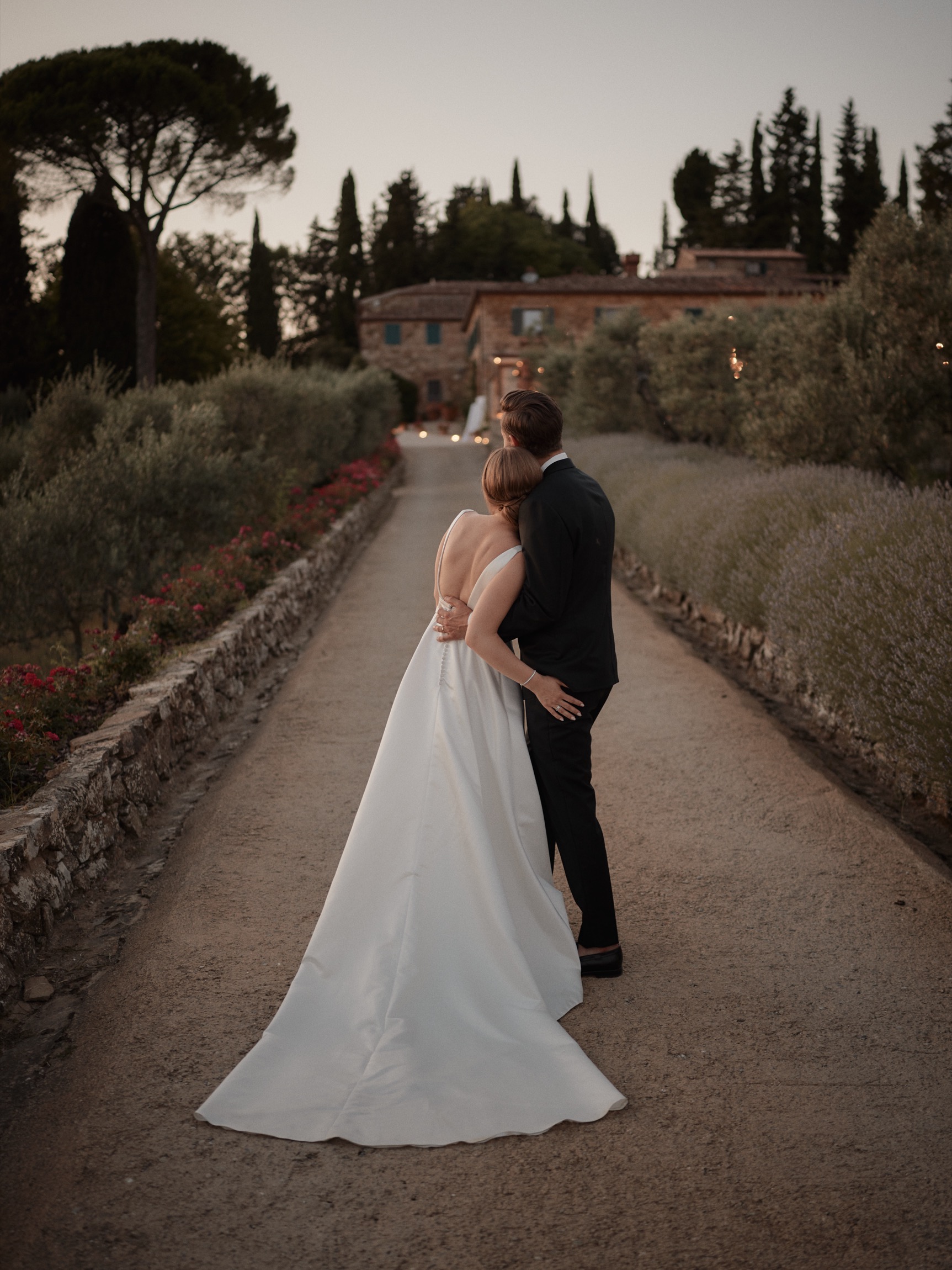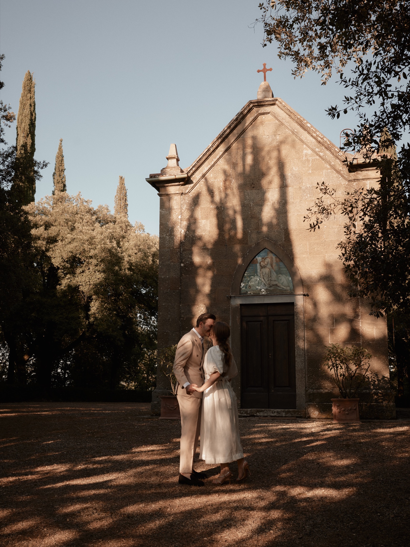 The following day brought the heart of the celebration—a beautiful ceremony in front of the estate’s intimate little church. With its rustic stone façade and breathtaking views, the setting was nothing short of magical. Dina and Alex exchanged vows under the Tuscan sun, with the surrounding hills and vineyards bearing witness to their love.