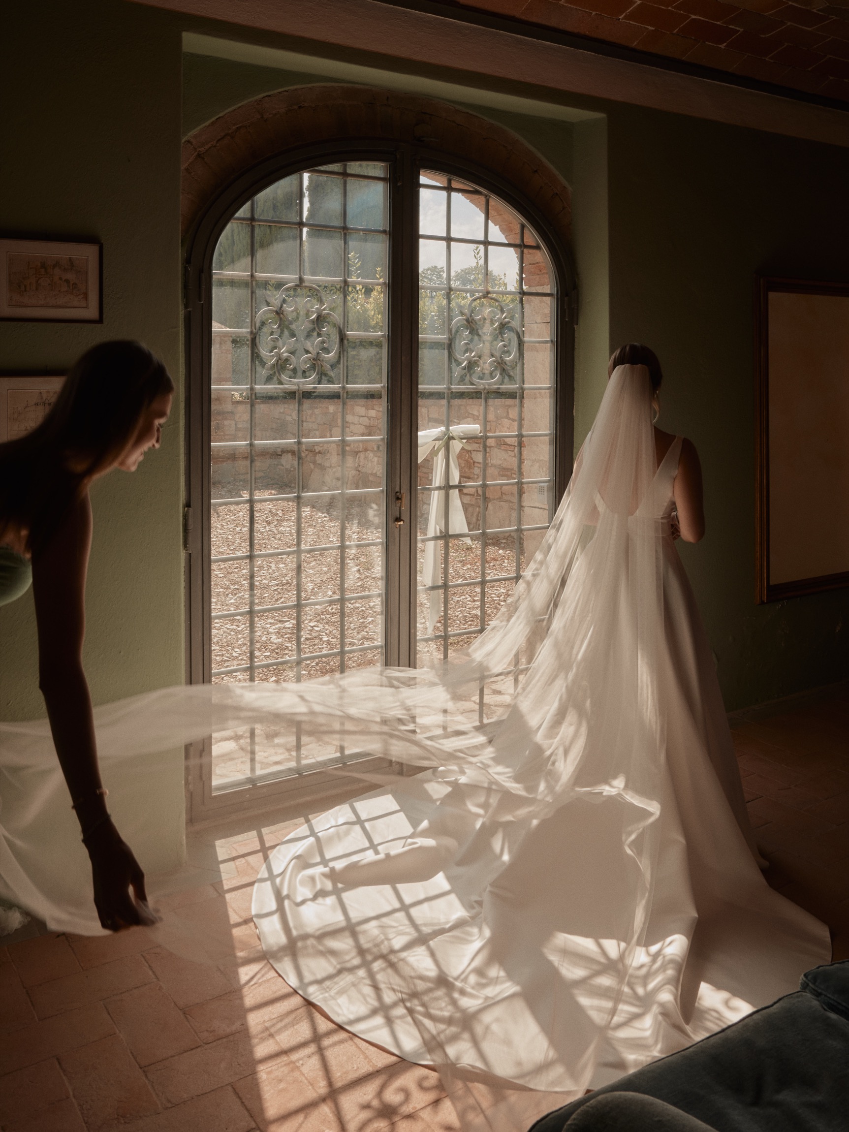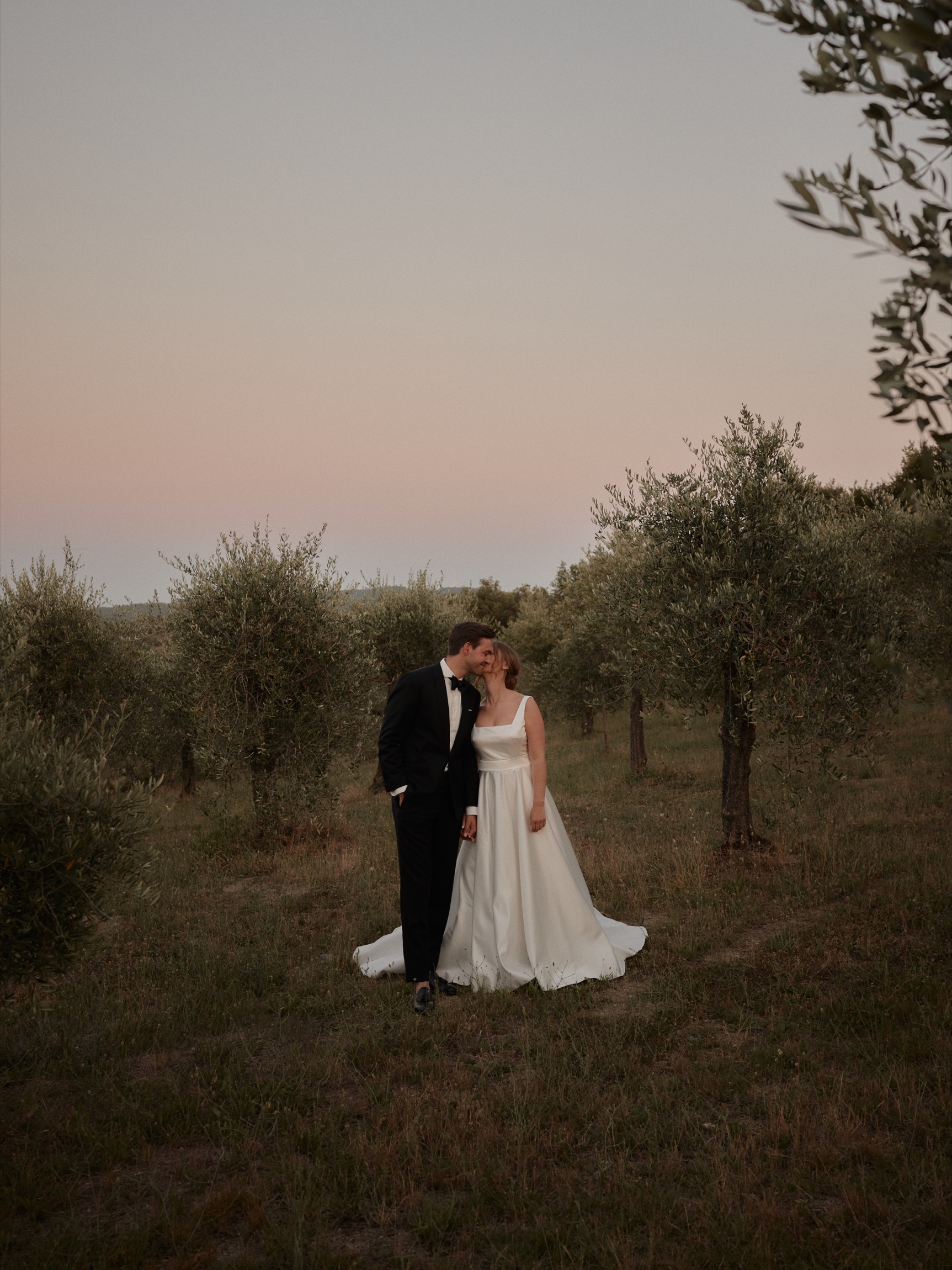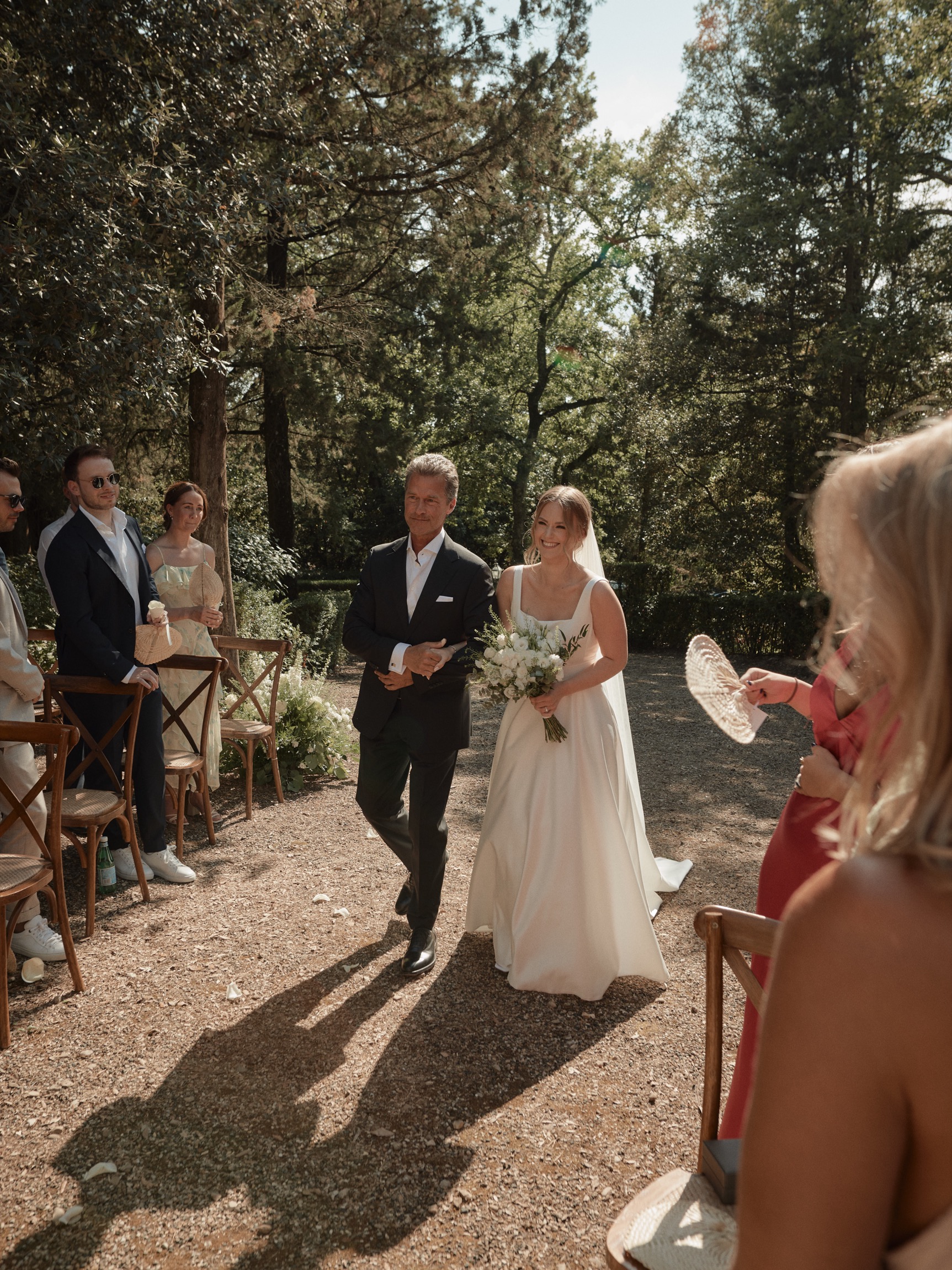 The following day brought the heart of the celebration—a beautiful ceremony in front of the estate’s intimate little church. With its rustic stone façade and breathtaking views, the setting was nothing short of magical. Dina and Alex exchanged vows under the Tuscan sun, with the surrounding hills and vineyards bearing witness to their love.