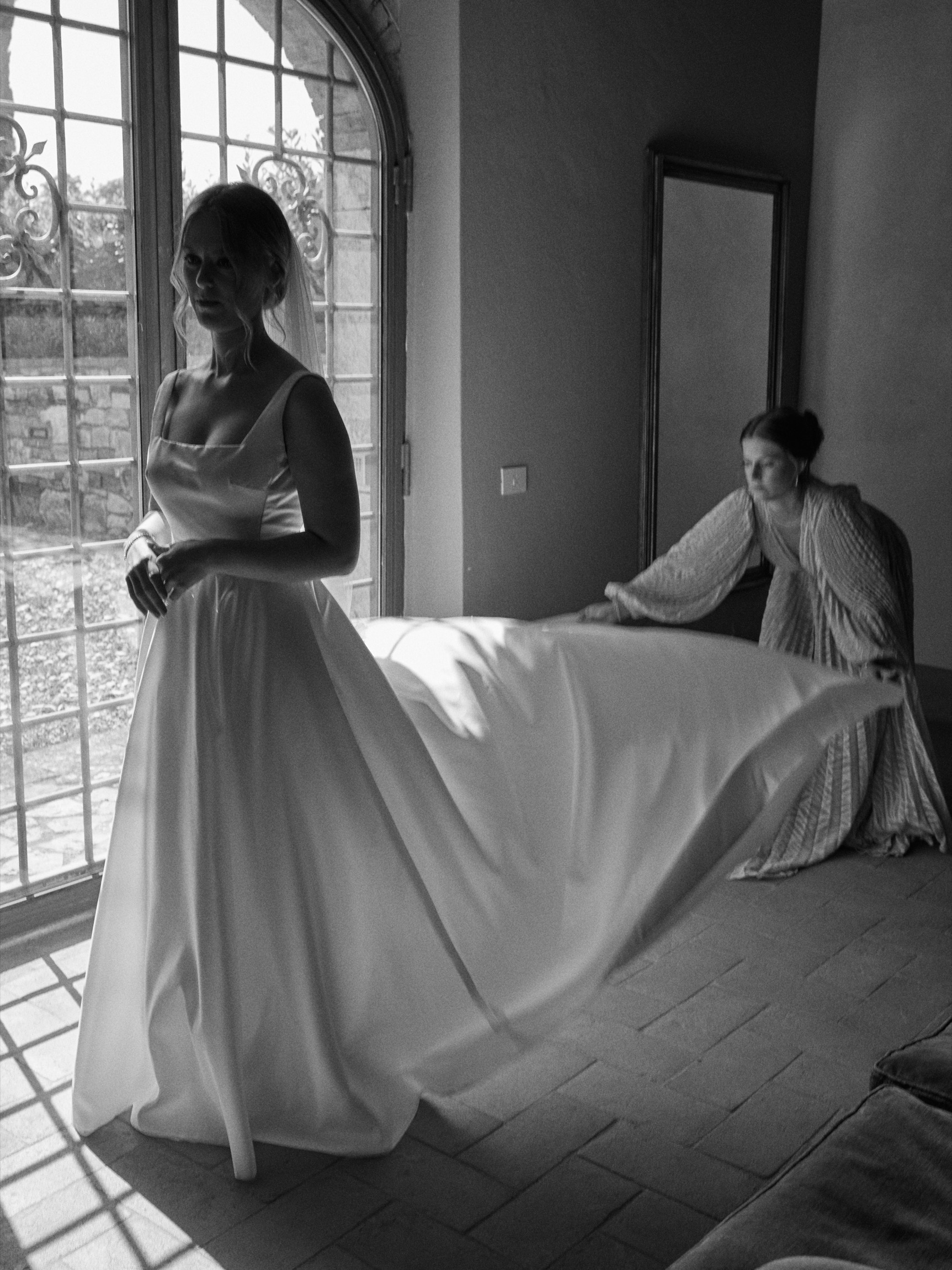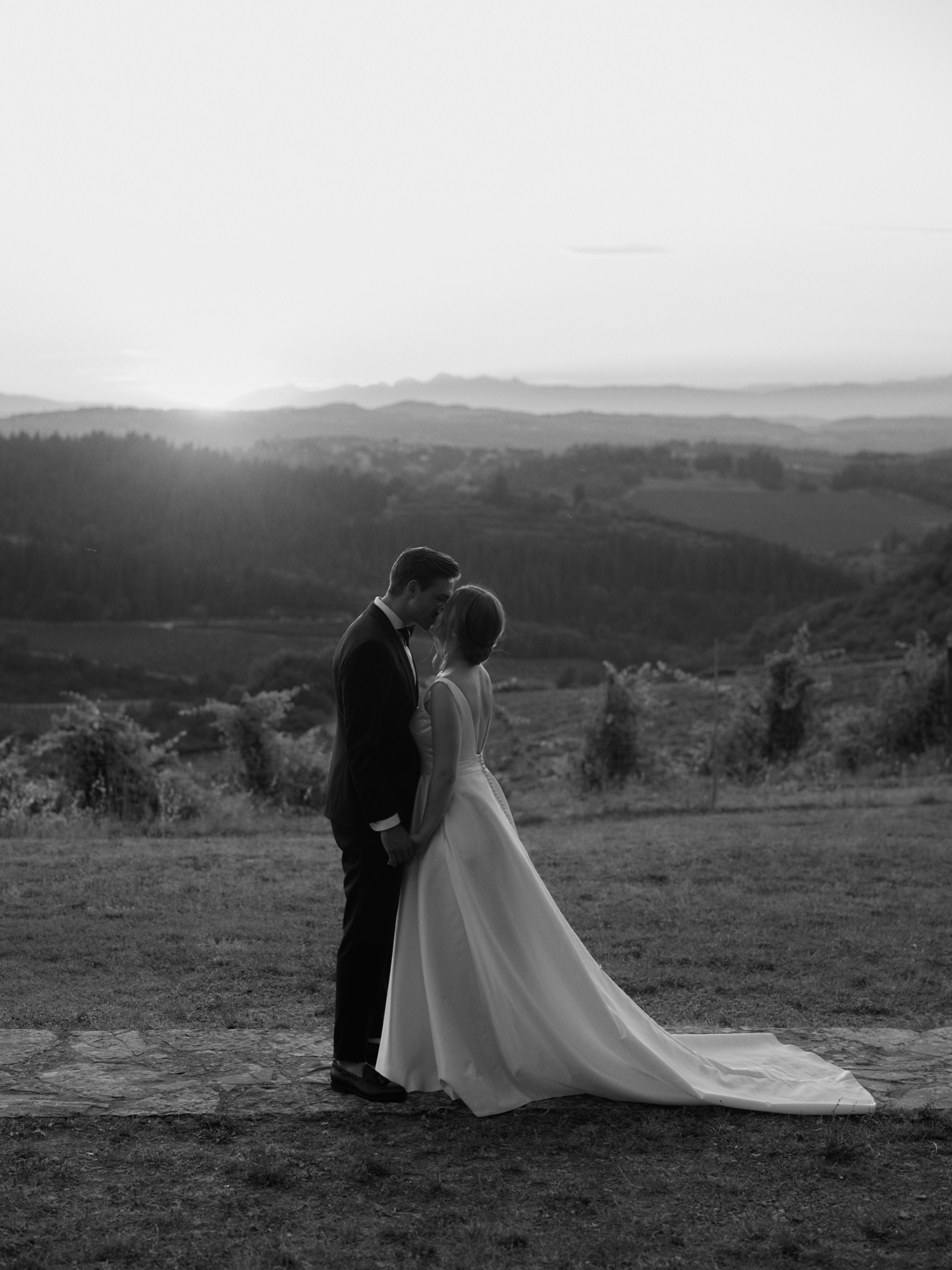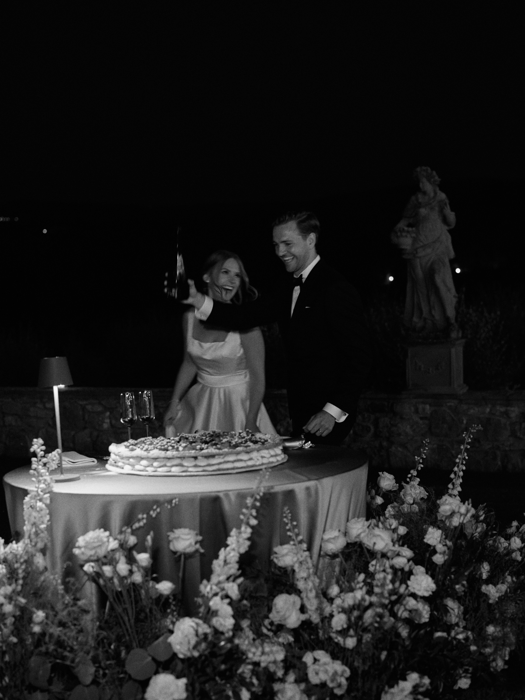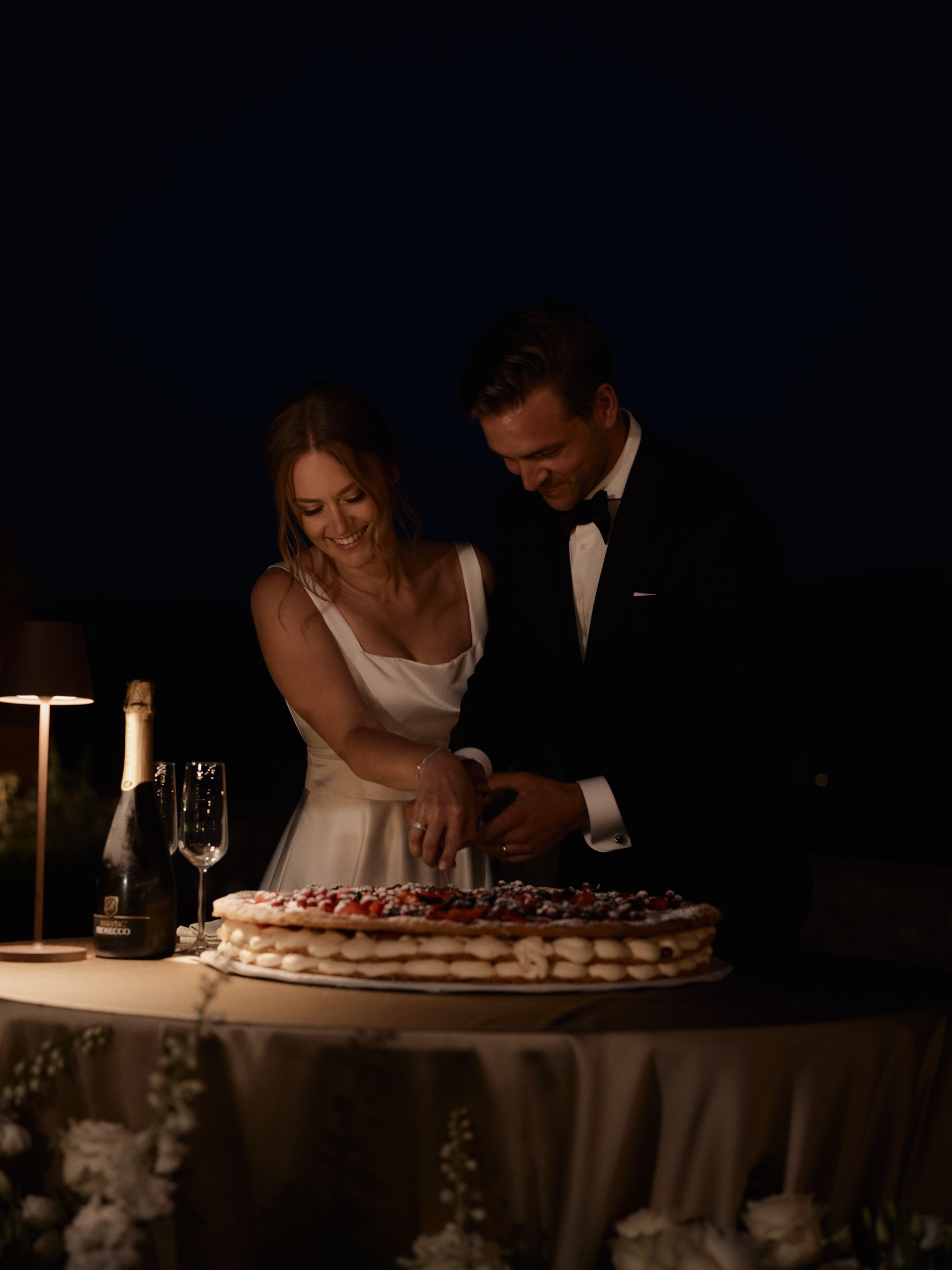 The following day brought the heart of the celebration—a beautiful ceremony in front of the estate’s intimate little church. With its rustic stone façade and breathtaking views, the setting was nothing short of magical. Dina and Alex exchanged vows under the Tuscan sun, with the surrounding hills and vineyards bearing witness to their love.